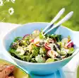 Cut bread into very thin slices. Heat 45 g fat in a pan and fry the bread until golden brown, turning it over. Let it cool down as well. Clean and wash the salad, pluck into bite-sized pieces and drain.