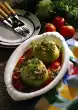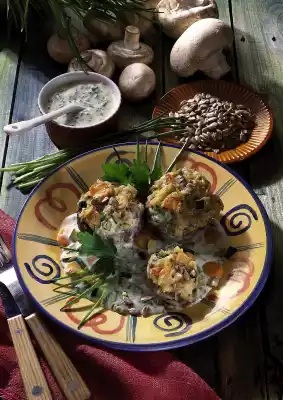 Season to taste with salt, pepper and curry. Stuff the mushrooms with the vegetable rice and place them in a large ovenproof dish. Put the rest of the vegetables and 1/4 litre stock into the form and bake in the preheated oven (electric: 200°C / gas: level 3) for approx. 25 minutes.