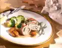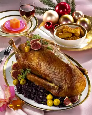 Keep the goose warm. Sieve and degrease the stock. Dissolve the roast with a little water, add the rest of the calvados and cream. Stir flour and 5 tbsp. water until smooth. Thicken sauce with it, simmer for about 5 minutes and season to taste. Arrange everything and garnish. Served with: red cabbage and croquettes