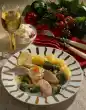 For the filling, remove the mugwort from the stems. Drain the chestnuts and cut them in half if necessary. Peel onions and dice 1 coarsely. Wash 3 apples, remove seeds and dice them. Mix everything with breadcrumbs. Season with salt, pepper and 1 pinch of sugar