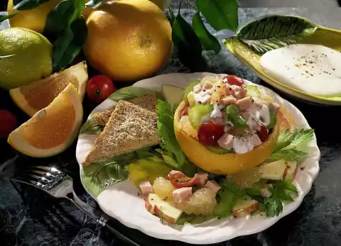 Cut the cured pork into small cubes. Cut grapefruits in half. Remove the flesh from the inner skins. Remove the skin afterwards. Mix the prepared ingredients and fill into the grapefruits. For the sauce stir yoghurt and mayonnaise until smooth.