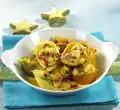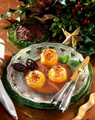 Drain the apricots on a sieve. Mix the marzipan, armagnac and icing sugar with the whisk of the hand mixer to a smooth mixture. Place the apricot halves on a baking tray lined with baking paper. Pour the marzipan mixture into a piping bag with a star-shaped spout, squirt the tuffs into the apricots and bake in a preheated oven (electric range: 200 °C / gas: level 3) for 10-15 minutes. In the meantime, melt ice. Serve apricot halves and chocolate ice cream sauce sprinkled with chocolate shavings on a plate. Dust with icing sugar and cocoa as you like, serve dessert decoration and lemon balm