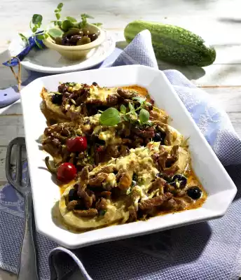 Stir in olives and season with salt and pepper. Divide the gyros into the cucumber halves and pour the frying stock into the mould. Coarsely grate the gouda and feta cheese, mix and sprinkle thickly over the filled cucumbers.