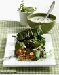 Peel the garlic and press it through a garlic press to the meat. Add 2 tablespoons of oil and gyros spice and mix well. Clean, wash and cut the spring onions into rings. Lift the cucumbers out of the salt water with a skimmer, let them drain and put them into an ovenproof dish.