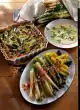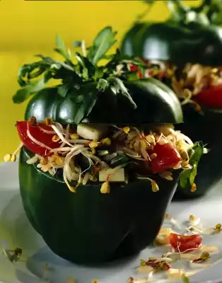 Pour rice on a sieve, rinse with cold water and drain well. Clean and wash the rocket, dab dry and pluck half into bite-sized pieces. Mix rice, sprouts, cheese, onion, tomatoes and plucked rocket. For the marinade, mix mustard, garlic, salt, pepper, sugar, vinegar and soy sauce. Whip the oil into it. Pour the marinade onto the rice-vegetable mixture and leave to soak for approx. 30 minutes. Fill the rice salad into the peppers, place the lid on top and place the remaining rocket in the stem of the lid