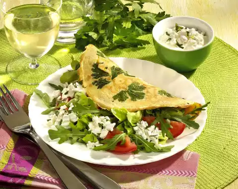 Put 1/4 of the parsley leaves in the pan. Pour 1/4 of the dough over it and bake on both sides. Bake another 3 pancakes in the same way. Put the pancakes on 4 plates. Put rocket, lettuce and tomatoes on one half of each pancake and fold over. Spread some sauce over them. Add the rest of the sauce, sprinkle with chopped parsley