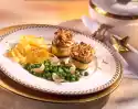 Remove the cured pork loin and apples. Sieve the stock, bring to the boil with cream. Bind and season to taste. Serve everything. Serve with dumplings or boiled potatoes