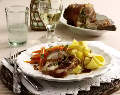 Prepare the pasta in boiling salted water according to the instructions on the packet. Heat butter. Sauté the carrots for about 1 minute, add 100 ml stock, bring to the boil and simmer for 5 minutes. Remove the roast, wrap in aluminium foil and let it rest.