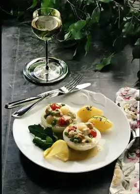 Peel, wash and cut the kohlrabi in half crosswise. Hollow out each with a ball cutter or teaspoon. Keep inside. Put the kohlrabi halves in boiling salted water and cook for about 10 minutes.