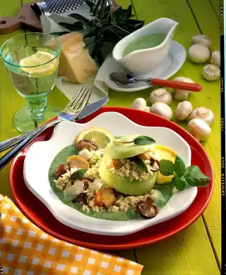 Puree everything with a chopping stick. Season to taste with salt, pepper and lemon juice. Fill the kohlrabi with some risotto. Put them into an ovenproof dish and heat them up again in the preheated oven (electric cooker: 200 °C/ gas: level 3) for another 10 minutes. Serve with the sauce and remaining risotto. Serve garnished with lemon and fresh herbs