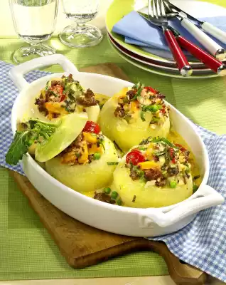 Wash, clean and halve the tomatoes. Peel, halve and finely dice the onion. Drain rice and kohlrabi separately, drain. Collect the kohlrabi stock. Fry the minced meat in hot oil. Add onion and paprika and fry over medium heat for 2-3 minutes. Mix in tomatoes and rice, put aside. Hollow out the kohlrabi, leaving a rim (about 8 mm). Finely dice the inside of the kohlrabi, add to the rice mixture, season with salt and pepper. Place the kohlrabi in an ovenproof dish and fill with the rice mixture. For the sauce, measure 250 ml kohlrabi stock and bring to the boil. Stir in cream cheese and stock. Simmer for 2 minutes, stir in the sauce thickener.