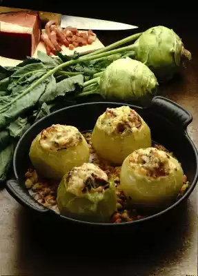 Clean, wash and peel the kohlrabi. Wash and finely chop the tender kohlrabi leaves. Cook the kohlrabi in boiling salted water for 20 minutes. Drain and let cool. Carefully raise the kohlrabi with a teaspoon (up to a 1 cm wide rim).