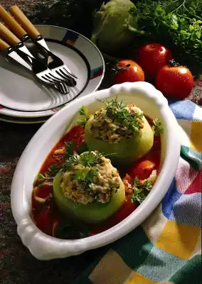 Mix tomato juice, diced kohlrabi lids and inside, tomato and onion slices. Season with salt, pepper and paprika and spread around the kohlrabi. Cook in the preheated oven (electric cooker: 200 °C/ convection oven: 175 ° C/ gas: level 3) for 15-20 minutes