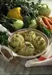 Cover and cook for 8-10 minutes. 1 minute before the end of the cooking time, stir in 1/3 of the spring onions. Put the lentils aside. Remove kohlrabi from the vegetable water and rinse with cold water. Hollow out the tubers with a ball cutter. Mix 3/8 litres of vegetable water and crème fraîche and pour into an ovenproof dish. Chop the hollowed out kohlrabi meat and put half of it with the remaining spring onions into the ovenproof dish. Fold the rest of the kohlrabi and 60 g of cheese into the lentils, fill the vegetables with it and place them in the mould. Sprinkle with remaining cheese. Bake in the preheated oven (electric cooker: 200 °C/ gas: level 3) for approx. 30 minutes.