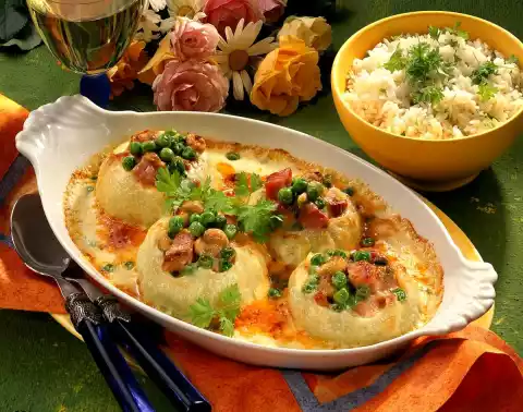 Cut off the tops of the kohlrabi. Hollow out the kohlrabi and put it in a fireproof dish. Finely dice the lid and inside and add to the sauce. Fill the kohlrabi with the smoked pork loin mixture and pour the sauce over it. Bake everything in a hot oven (electric cooker: 200 °C / convection oven: 175 °C / gas: level 3) for about 20 minutes. Garnish with chervil. Rice tastes good with it