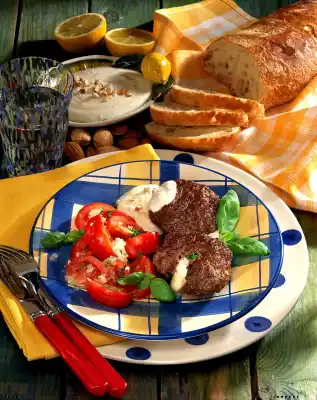 Put some leaves aside for garnishing. Knead minced meat, breadcrumbs, egg, half of the diced onions, salt, pepper and paprika. Form 8 meatballs from the minced dough, press a hollow in the middle, put wrapped mozzarella balls in it and form a meatball again. Heat the oil in a pan and fry the meatballs in it over medium heat for about 9 minutes on each side. In the meantime, clean, wash and quarter the tomatoes. Mix vinegar, salt, pepper and sugar. Beat in olive oil. Coarsely chop the almonds. Mix yoghurt, lemon juice, salt, pepper, sugar and almonds. Mix tomatoes, remaining onion cubes, basil strips and the vinaigrette.