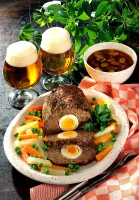 Form a loaf from the minced dough. Peel the hard-boiled eggs and press them into the middle of the loaf. Press the dough back together again.