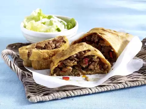 Place the dough with the long side facing forward. Pour the minced meat into the middle third of the dough. Fold the right and left third of the dough over the mince. Press the edges so that the roll is closed. Cut the top of the dough diagonally.