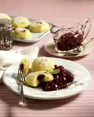 Remove the lid quickly so that no water falls on the dumplings. Arrange the dumplings and stewed cherries on plates, decorate with mint.