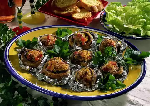 Clean and wash the mushrooms, unscrew the stalks and dice. Clean, wash and also dice the peppers and tomatoes. Heat oil in a pan and fry mushroom, onion and paprika cubes. Wash parsley, dab dry and chop finely. Add tomatoes and parsley. Roughly dice the cheese and also add it to the vegetables. Season to taste with salt and pepper. Pour the mixture into the mushrooms and sprinkle with parmesan cheese. Wrap the mushrooms in aluminium foil and cook on the hot grill for about 10 minutes. Serve with lettuce and garlic baguette