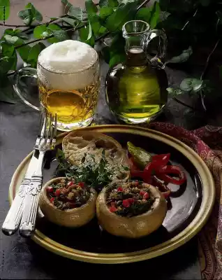 Add the filling to the mushrooms. Place in greased aluminium foil. Grill for about 10-15 minutes. Serve garnished with thyme. Serve with a salad of paprika and pickled peppers and fresh baguette.