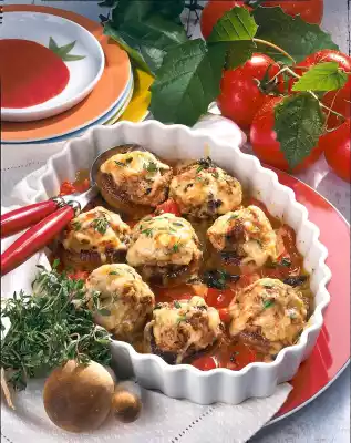 Season the mushrooms and fill with the sausage meat. Place in an ovenproof dish. Grate the cheese coarsely and spread on top. Wash and clean the tomatoes, dice roughly and distribute around the mushrooms. Pour on broth. Bake in the preheated oven (electric cooker: 200 °C / convection oven: 175 °C / gas: level 3) for about 20 minutes. Sprinkle with remaining thyme