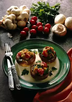 Season with salt, pepper and paprika. Wash the parsley and put something aside for garnishing. Chop the rest and stir in. Pour the mixture into the mushrooms. Sprinkle with cheese. Bake in the preheated oven (electric cooker: 225 ° C/ gas: level 4) for about 10 minutes.