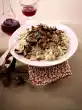 Clean and wash the leek and cut into fine rings. Peel and finely chop the onion. Heat the oil in a large pan. Sauté onion and mushroom stems in it. Steam the leek briefly. Deglaze with 3/8 l water and stir in the stock. Bring to the boil and simmer for about 5 minutes