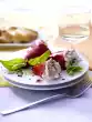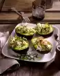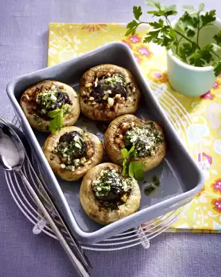 Drain the snails and let them drip off. Grease an ovenproof dish. Put mushroom heads into the dish. Fill with fried mushroom cubes and one snail each. Spread the butter mixture on top. In a preheated oven (electric cooker: 175 °C/ convection oven: 150 °C/ gas: see