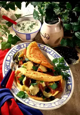 Wash the parsley, chop 2/3 finely and stir into the cream. Drain the artichokes on a sieve and cut them in half. Heat the fat for the filling. Sauté the artichokes in it. Add salami slices and olives.
