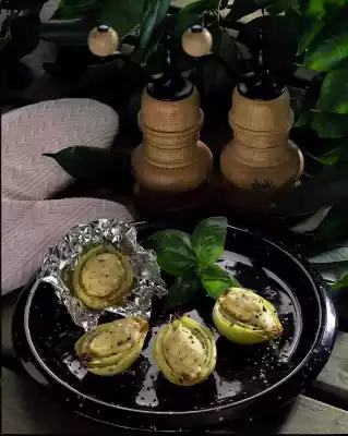 Onions peel, lengthwise halve. Carefully hollow out. Chop the hollowed out finely. Mix with cream cheese, egg yolk and milk. Place on greased aluminium foil. Grill for about 8 minutes. Garnish with basil as desired
