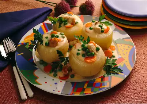 Then take out and let drain. Bind the ragout with sauce thickener. Season to taste again. Stuff the onions with it and arrange on a plate garnished with parsley. Add the rest of the ragout.