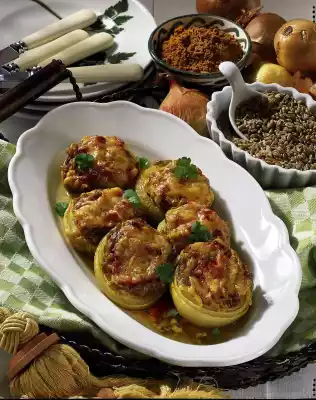 Stir the diced peppers, coriander and sour cream into the green spelt curry. Season to taste again. Cook onion halves in boiling salted water for about 5 minutes. Take out and measure 200 ml vegetable water. Fill onions with green spelt curry.