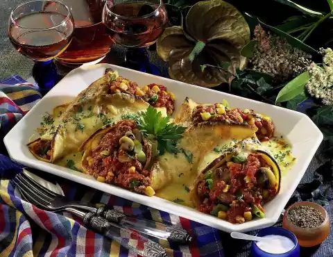 Add the stock and milk bit by bit, stirring constantly, and simmer for about 15 minutes at low heat. Grate cheese and stir 2/3 into the sauce. Season with salt and pepper. Fill the pancakes with the minced meat mixture and fold them up like bags.