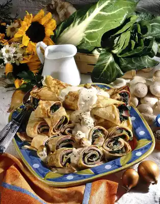 Deglaze with broth. Stir in sour cream and simmer for about 5 minutes. Season to taste with salt, pepper and cayenne pepper. Cover each pancake with 2 slices of ham and one eighth of the chard and roll it up. Cut them diagonally into slices as you like. Serve with the mushroom sauce