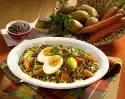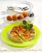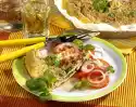 Clean, wash and cut the spring onions into rings. Peel garlic and chop finely. Drain pineapple and cut into pieces. Heat oil in a coated pan. Fry white spring onion rings and garlic in it. Add minced meat and fry. Season with salt, pepper and paprika. Add leek onion green and pineapple, pour sauce and heat up with. Flavour again. For the pancakes whisk flour, milk, eggs and salt. Heat up the fat and fry four pancakes one after the other until golden brown. Fill the pancakes with the minced meat mixture and arrange on a plate. Wash parsley, dab dry and chop. Sprinkle over the pancakes