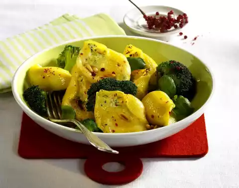 Mix ricotta and parmesan. Season vigorously with salt and pepper. Coarsely chop half of the broccoli and mix with the ricotta mixture. Fill the pasta with the ricotta mixture. Place the pasta and the remaining broccoli in an ovenproof casserole dish.