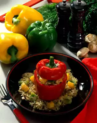 Fill the red pods with half of the vegetable rice. Heat the vegetable stock in a small pot. Put the stuffed peppers in and cook covered for about 15 minutes. After 5 minutes add remaining vegetable cubes. Stir the sauce thickener in sour cream until smooth and thicken the vegetable stock with it. Fold the rest of the rice into the vegetables and heat up. Season again and arrange on a plate