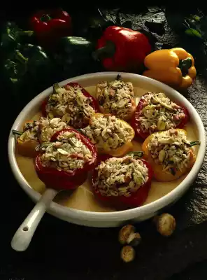 Remove the peppers and keep warm. Boil up vegetable water and cream. Remove the sauce from the heat and alloy the sauce with the egg yolk. Season to taste with salt and pepper. Add sauce and peppers and fill with the rice mixture. Serve immediately