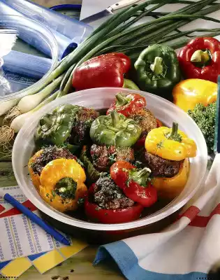 Season with salt, pepper and paprika. Fill the peppers with the mince, put the lid on and place in an ovenproof dish. Bake in the preheated oven (electric cooker: 200 °C/ gas: level 3) for approx. 45 minutes.