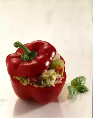 Add vegetables and basil to the rice about 5 minutes before the end of the cooking time. Season with salt and pepper. Cut the lid off the pepper. Clean and wash the peppers. Fill the vegetable rice into the peppers