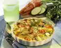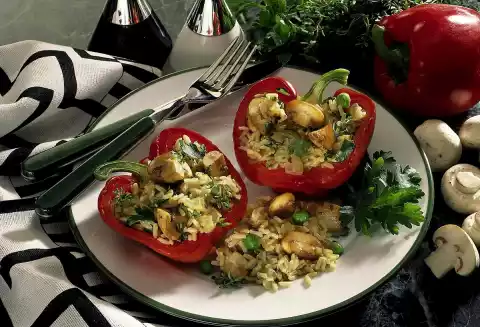 Deglaze with broth. Cover and cook over low heat for 30-35 minutes. Fold in peas. Boil up again. Season with salt and pepper. Fold half of the cheese and mushrooms into the rice. Wash the peppers, cut them in half lengthwise and clean them. Fill with the rice. Put the bell peppers on a baking tray covered with baking paper. Sprinkle the remaining cheese on top. Bake in a preheated oven (electric: 200 °C/ gas: level 3) for 15-20 minutes.