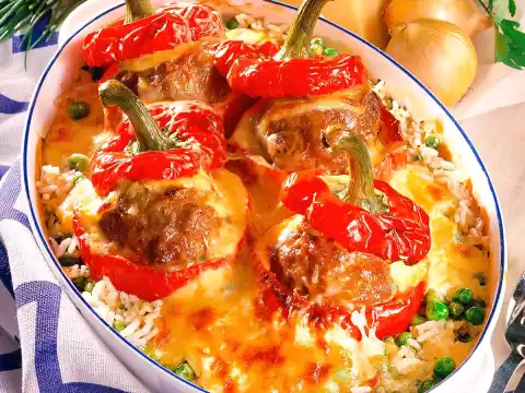 Heat the fat in a pot, sauté the flour in it and deglaze with milk and stock. Season to taste with salt and pepper and bring to the boil. Drain rice and let it drain, mix with herbs and peas and fill into an ovenproof dish. Fill the peppers with minced dough, put the lid on top. Arrange on the rice. Cover with sauce and sprinkle with cheese. Bake in the preheated oven (electric cooker: 200°C/ gas: level 3) for about 45 minutes