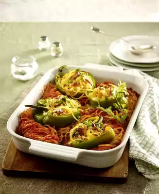 Halve the peppers and remove the seeds. Wash the bell peppers and dab dry. Spread cream noodles into the paprika halves. Spread the tomato noodles in an ovenproof dish greased with oil and place the peppers on top.