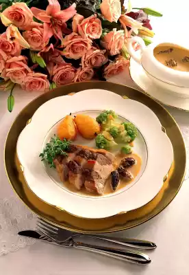 Mash the potatoes, mix with the dough. Shape into pears, add cloves. Pepper pheasant breasts, cut them twice lengthwise. Mix mince, mustard, salt, pepper and thyme. Fill into the meat.
