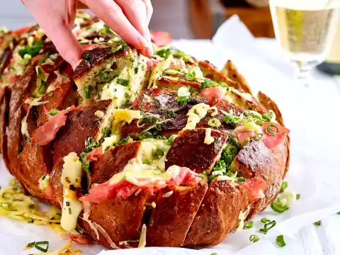 Cut bread diagonally (at a distance of approx. 3.5 cm) deep into the bread. Leave the lower part to stand for approx. 2.5 cm. Break open carefully so that the bread does not fall apart. Spread the cut surfaces thinly with 150 g butter. Spread mozzarella, cheese, ham and half of the spring onions evenly into the cuts.