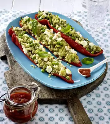 Cut the peppers in half lengthwise, clean and wash them. Blanch frozen peas in boiling salted water for about 2 minutes, drain and rinse. Put the couscous in a bowl and pour 350 ml of boiling water over it. Mix with 1 tsp. salt, 1 tbsp. olive oil and pesto and leave to stand for about 5 minutes