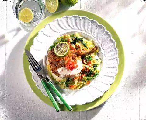 Fill chops with prepared onions. Whisk the egg yolks. Turn chops in egg yolk and flour. Fry in hot oil for about 2 minutes on each side. Arrange chops and cabbage on plates, garnished as desired with small tomato cubes and a slice of lime.