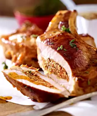 Wash the meat and dab dry. Cut a deep pocket into each cutlet. Press the filling well into it. Stick with wooden skewers. Heat 2 tablespoons of oil. Brown the chops on each side.