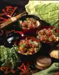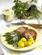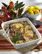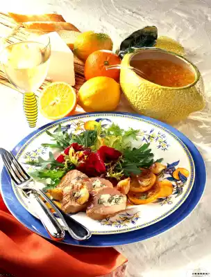Season with salt and pepper and add the filling to the fillet. Pin and tie up. Heat 2 tablespoons of oil in a frying pan, fry the pork tenderloin all around and finish frying at low to medium heat. After half the frying time, add shallots to one half and lemon slices. In the meantime, clean and wash the salad and pluck into pieces. Drain on a sieve. Wash the orange thoroughly and grate half of the peel. Halve the orange and squeeze it. Finely dice the remaining shallot. Mix orange juice and peel, shallot, some salt and cayenne pepper. Finally, fold in the remaining oil. Remove the pork tenderloin from the pan and deglaze the roast with stock and wine.